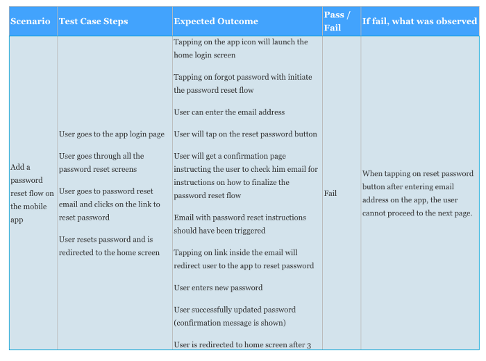 Test scripts or test cases are critical to the overall success of any QA strategy. Software projects run by inexperienced managers have very loose guidelines for software testing. In a previous life I once heard a vice president ask, “What so difficult about QA testing? Just make sure everything works.” This is a perfect example of a complete lack of understanding of testing and how it needs to be done. You can’t simply “test everything” — it’s not the way things are done As you’re improving a mobile flow or releasing a new piece of functionality, you need to provide clear documentation to the QA tester to ensure testing is done in a logical and systematic manner. It is typically the responsibility of the product team to ensure that the test script is clearly documented and understood by the tester / testing team. The template should be simple, and should be followed by anyone doing software development. I will illustrate this with an example.