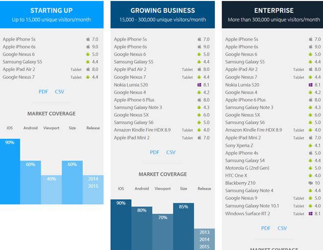 Given the complexity of mobile testing, there’s been an understandable surge in software-as-a-solution service options catering to streamlining QA testing. There is now an abundance of cloud-based emulators that QA testers can use to quickly test a certain functionality. Perhaps the most popular of these is browserstack.com, a subscription-based solution that a company can use to quickly and effectively test any mobile app. They started as an online simulator only, but as of 2016 Browser Stack testing is happening on actual devices as well. From a testing perspective you would expect QA engineers to test manually on 1/2/3 devices, and at least on the most popular version of Android and iOS. But a lot of testing, particularly for less-popular device types, screen sizes and iOS versions, should be done through an emulator to save time and money. For example, BrowserStack supports the following mobile types, and I’m sure many of their competitors do the same: