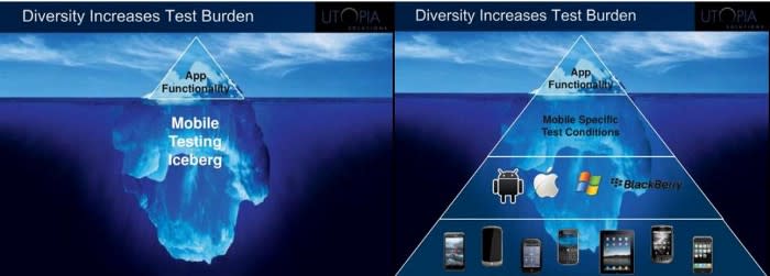 Mobile testing is difficult — it truly is, because there are so many different screen sizes, operating systems versions, network dependencies and other factors that can impact your overall test plan and timeline. Personally, I like how the difficulty of mobile app testing is captured on these two slides: