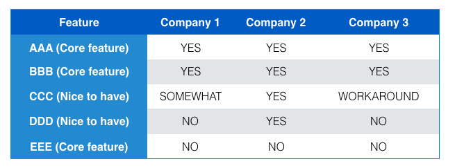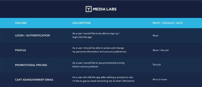 The next step is to take each and every one of these features and rank them based on a very simple algorithm: ‘must’, ‘should’ and ‘nice’ to have features.